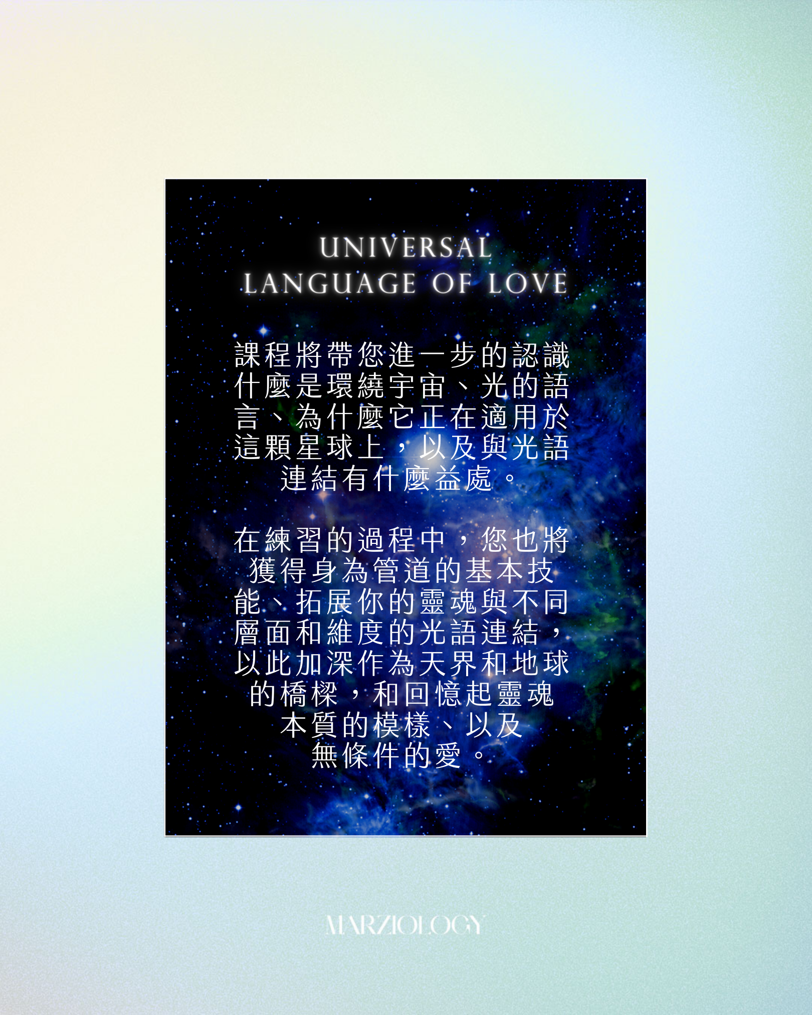 課程將帶您進一步的認識什麼是環繞宇宙、光的語言、為什麼它正在適用於這顆星球上,以及與光語連結有什麼益處。在練習的過程中,您也將獲得身為管道的基本技能、拓展你的靈魂與不同層面和維度的光語連結,以此加深作為天界和地球的橋樑,和回憶起靈魂最真實的一面,無條件的愛。